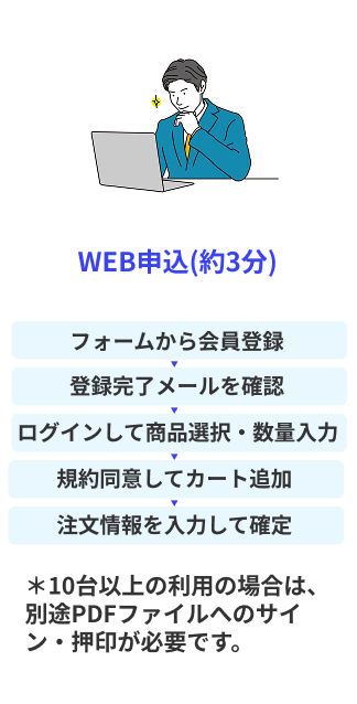 申込はWEBで完結。ご利用状況・請求・返却もマイページで確認・手続きができます。申込手続き完了後、5営業日以内に納品可能。故障時もスピード交換。
